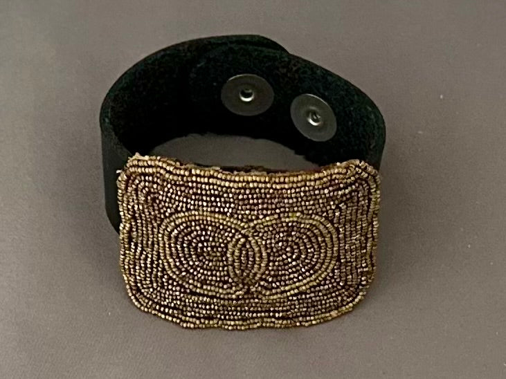 A stunning - rare gold-toned - vintage beaded Holfast French shoe buckle forms the centerpiece of this bracelet. 1" black leather cuff. Cuff can be attached at 6 1/2" or 7".