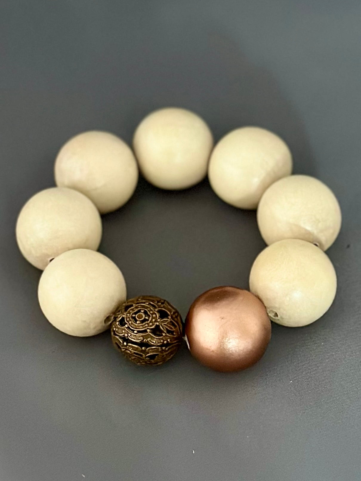 Inspired by my Aunt Edna—forever dressed to the nines and armed with a killer sense of humor—this bracelet features large 24mm wooden beads and a brass filigree focal bead. A bold, timeless piece with a wink of personality.