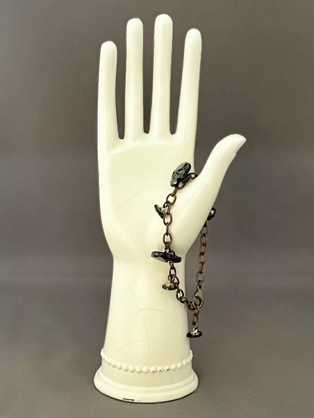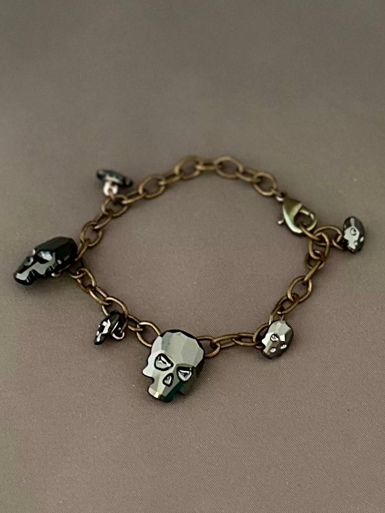 Meet Skully — A standout bracelet featuring hard-to-find hematite Swarovski crystal skull buttons linked along a natural brass chain. Sleek, moody, and full of shimmer, she mixes edgy sparkle with vintage brass warmth — a little bold, a little mysterious, and totally unforgettable.