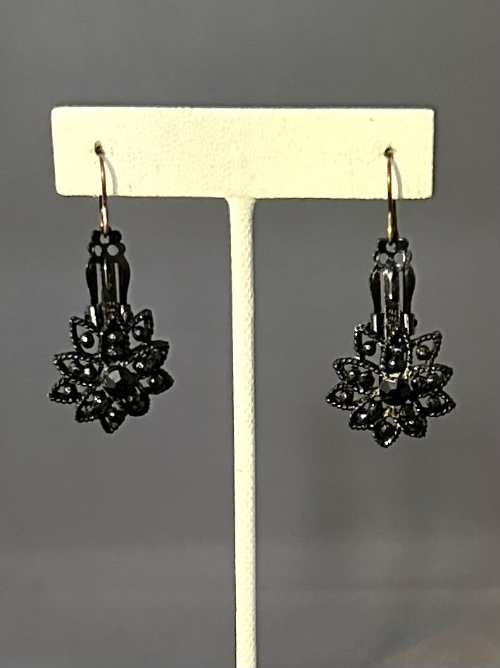 The Camila earrings — Vintage Weiss clip-ons turned into sharp little black drops. Packed with glossy jet rhinestones in a cool floral burst, they have that moody sparkle Weiss does best.