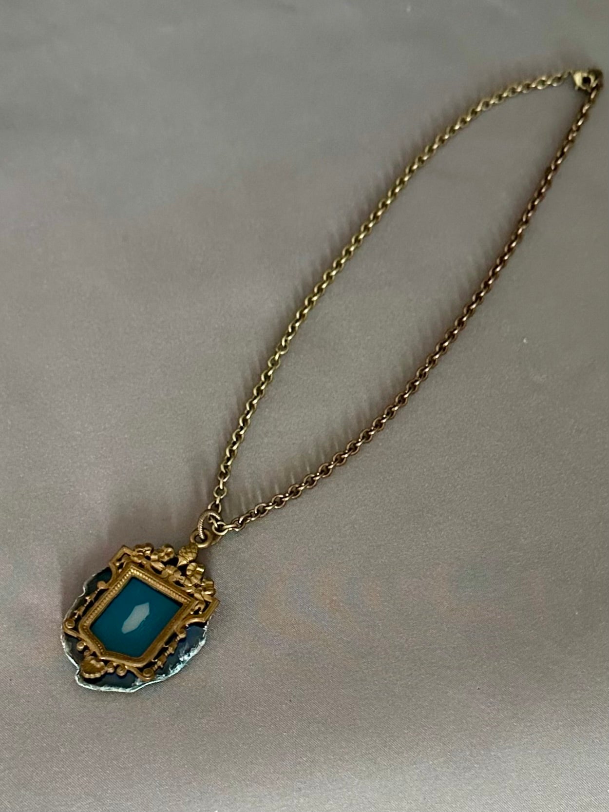 Beautiful blue agate surrounded by a unique vintage brass filigree frame. Stunning and one of my favorite pieces. 16" natural brass chain.