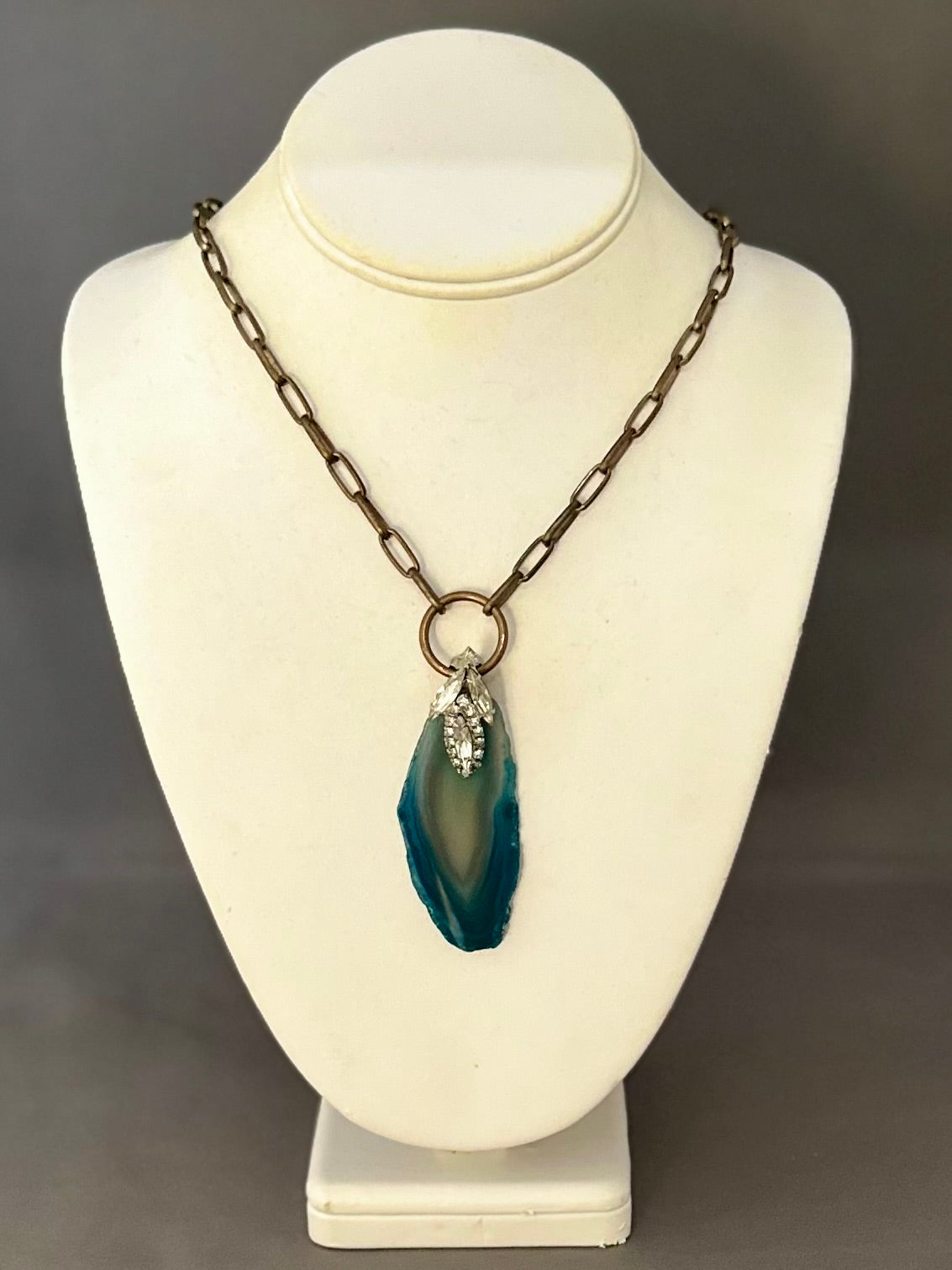 Brazilian agate in the bluest sea blue. Vintage signed Weiss clip earring. 20" natural brass chain.