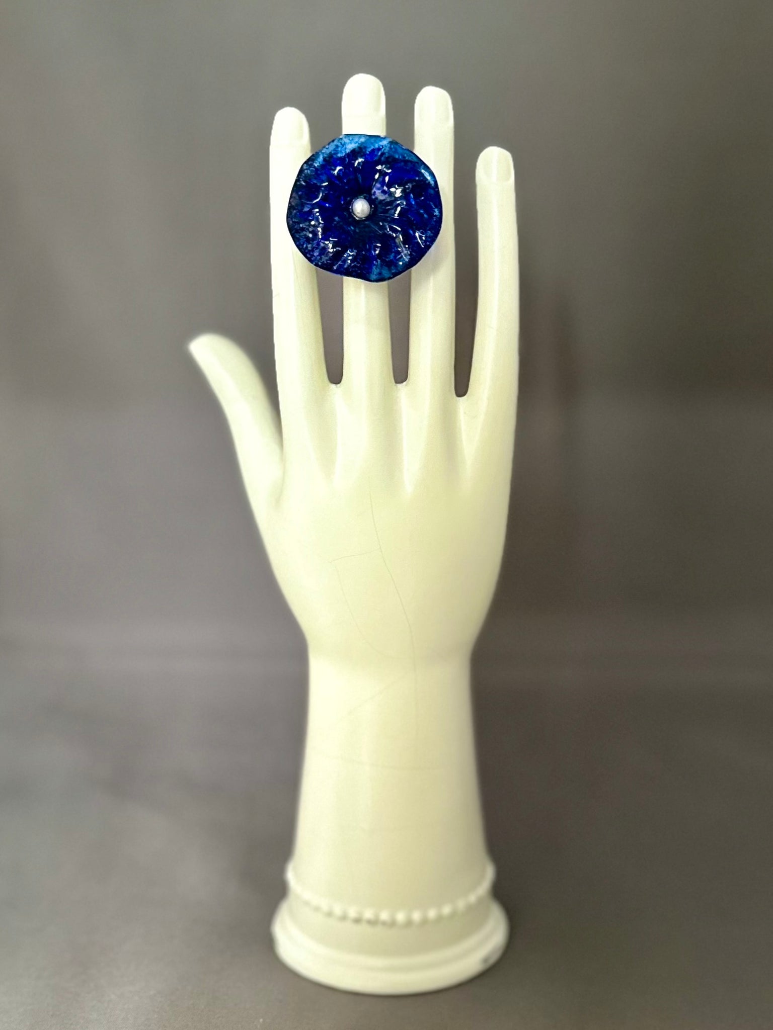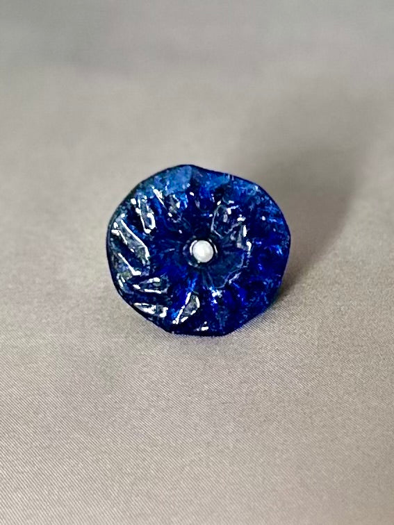 Meet Erma — A bold, earthy statement ring featuring a vintage blue glass chandelier disc set with a glass pearl at its center. Mounted on a rich brown wooden base, she blends retro glam with grounded warmth.