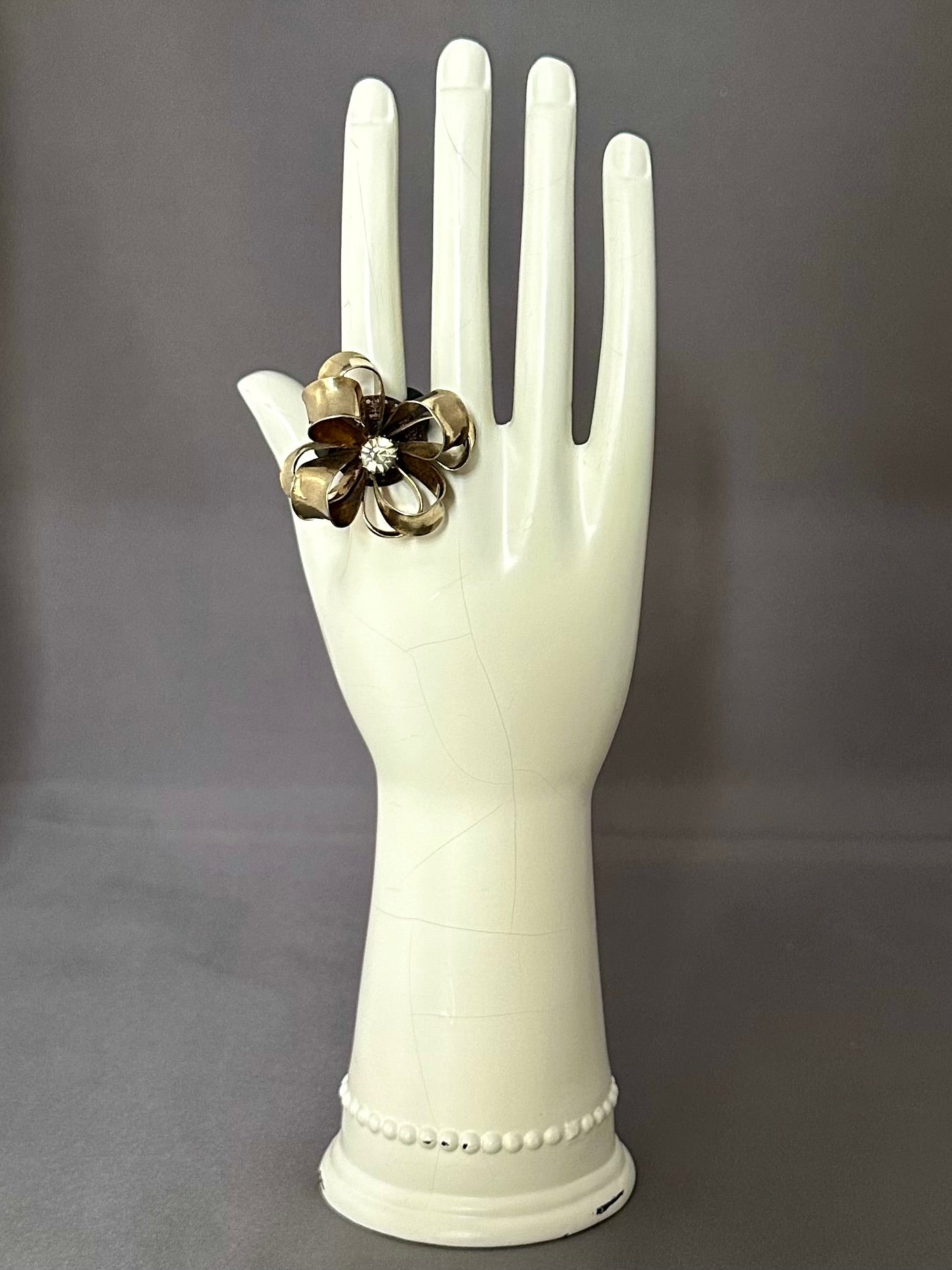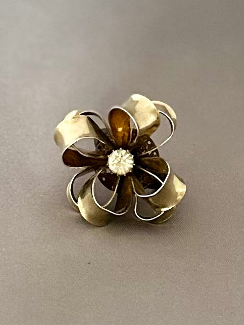Meet Tina — a ring created from a vintage bow-shaped brooch with a clear crystal at its center, reimagined into a fresh, modern piece. Set on a smooth wooden base, she brings together sparkle, charm, and natural warmth.