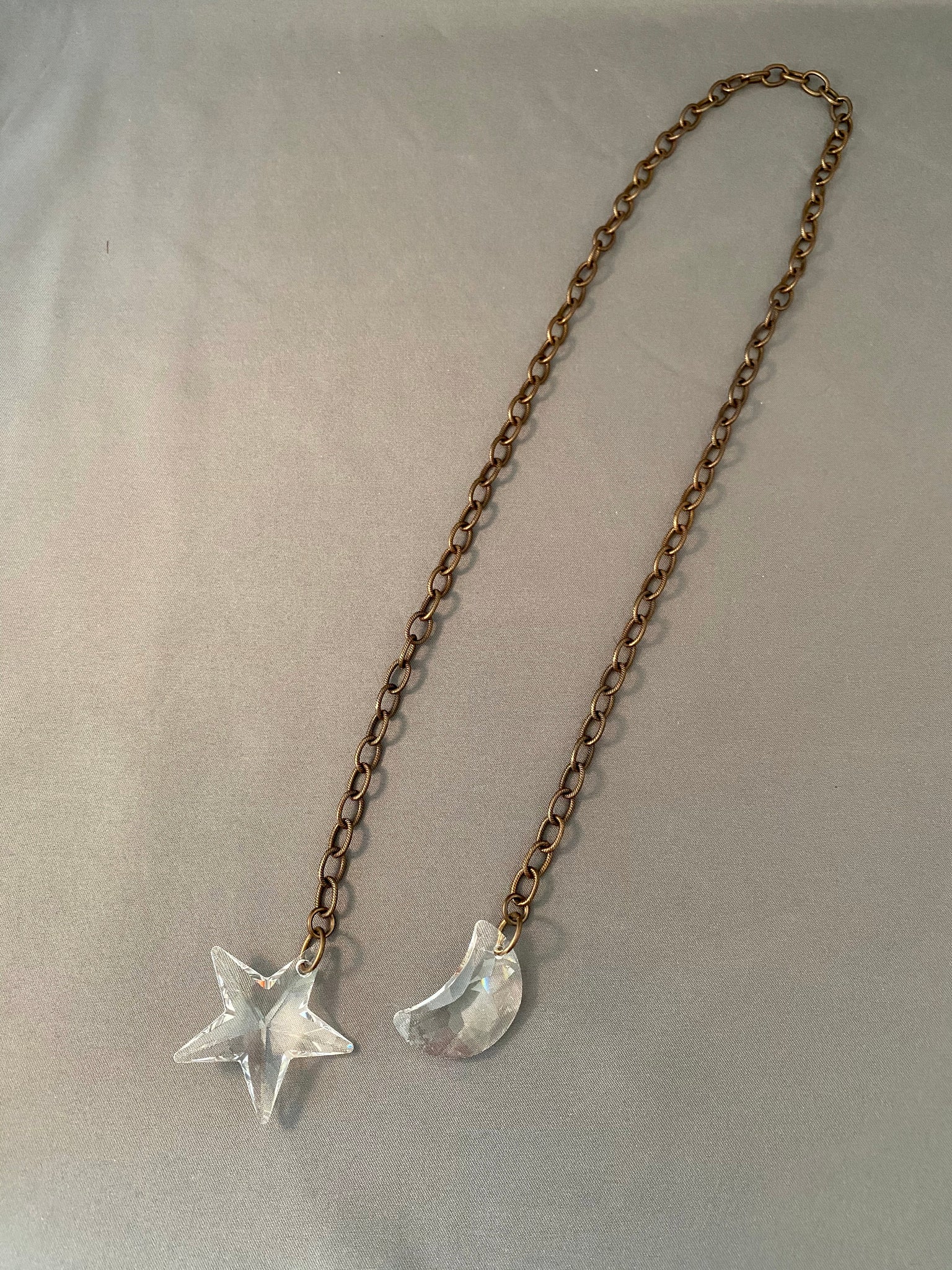 Rare vintage Swarovski clear crystal 40mm star and 30mm moon lariat necklace. Ties at neck. 22" natural brass chain.